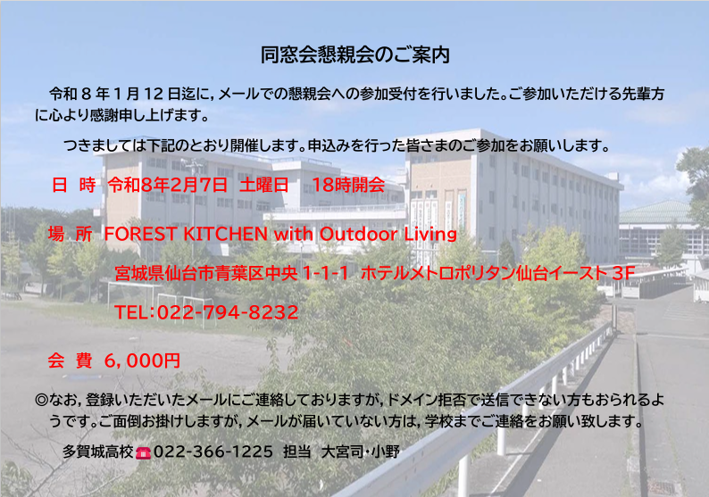令和8年2月7日開催 宮城県多賀城高校同窓会「翔朋会」懇親会のご案内 を掲載しました。